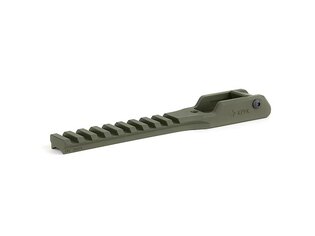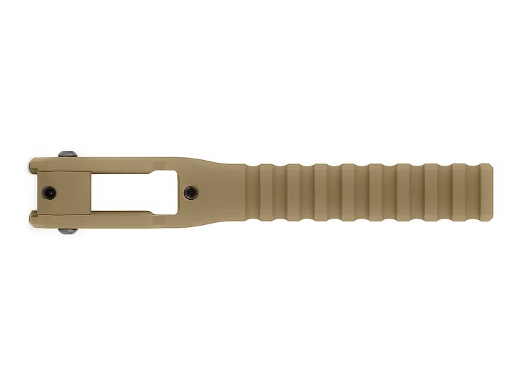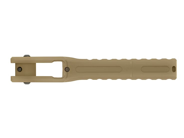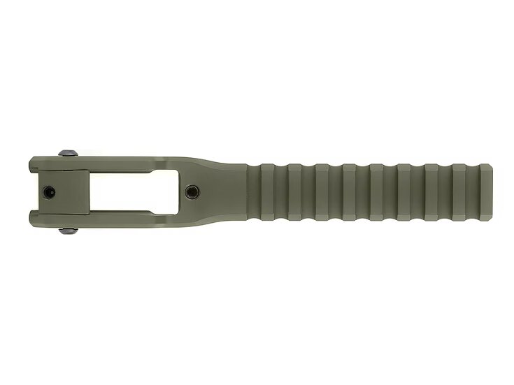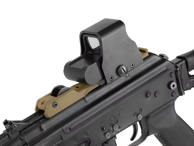 The mount clamps to the receiver cover and requires no alterations to the weapon. Attachment remains stable in use while the original iron sights stay fully usable — no compromise between legacy sights and modern optics.