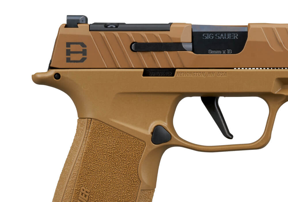 The stainless steel slide features distinctive DH3 serrations and lightening cuts. A Coyote Cerakote finish enhances durability while giving the model its signature appearance. The slide design is both functional and visually distinct from standard P365 variants.