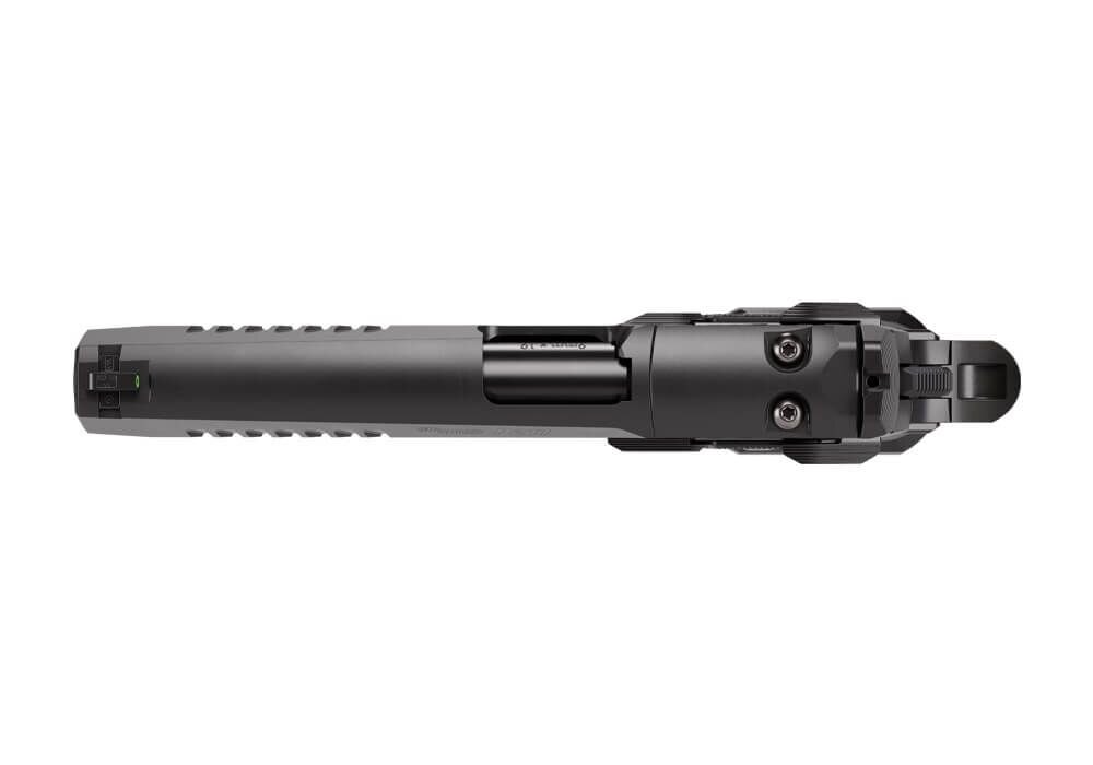The pistol is built on a steel frame with a full-length Picatinny accessory rail. The aluminum grip module with G10 grip panels ensures a firm and stable grip. All primary controls are fully ambidextrous, allowing intuitive operation for both right- and left-handed shooters.