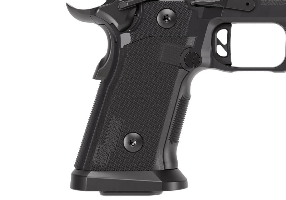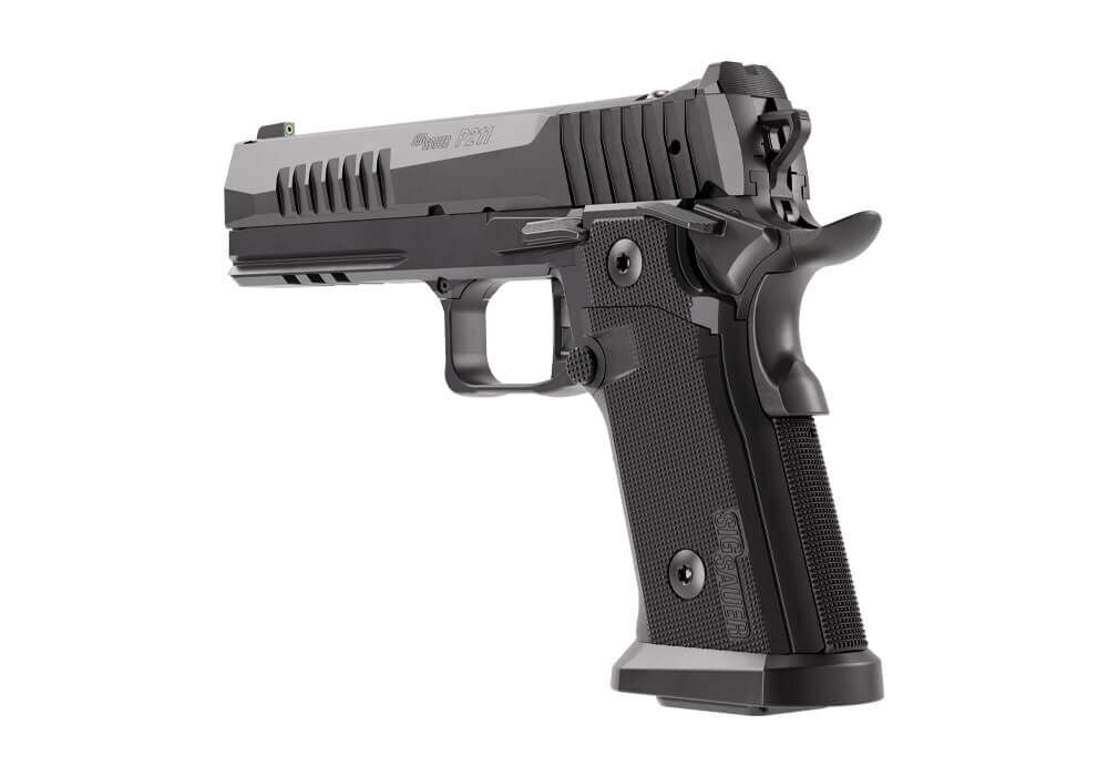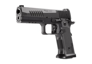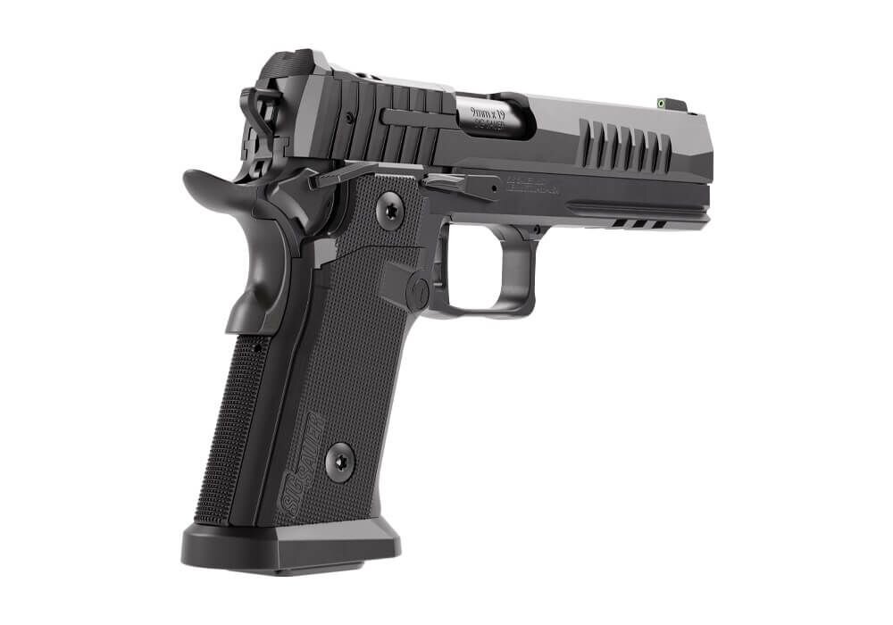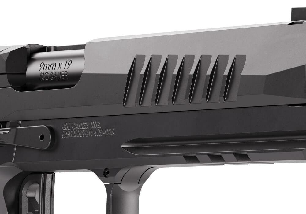 The full-size slide incorporates the SIG-LOC PRO interface for direct mounting of modern pistol red dot optics. Aggressive front and rear slide serrations ensure secure manipulation under demanding conditions. The slide design supports both professional duty use and dynamic competition shooting.