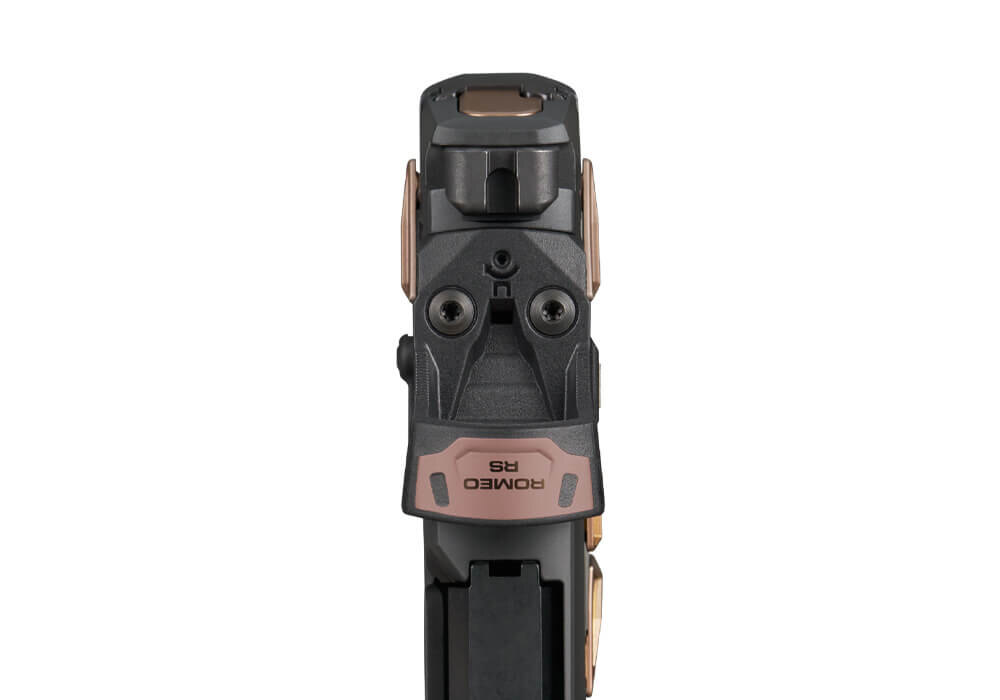 The slide comes equipped with the ROMEO-RS Compact red dot featuring a 3 MOA dot reticle. The optic utilizes an aspherical glass lens for minimal distortion and offers eight brightness settings controlled via a side-mounted button. Battery life reaches up to 20,000 hours of operation. The low-profile design supports rapid target acquisition and a stable sight picture during firing.