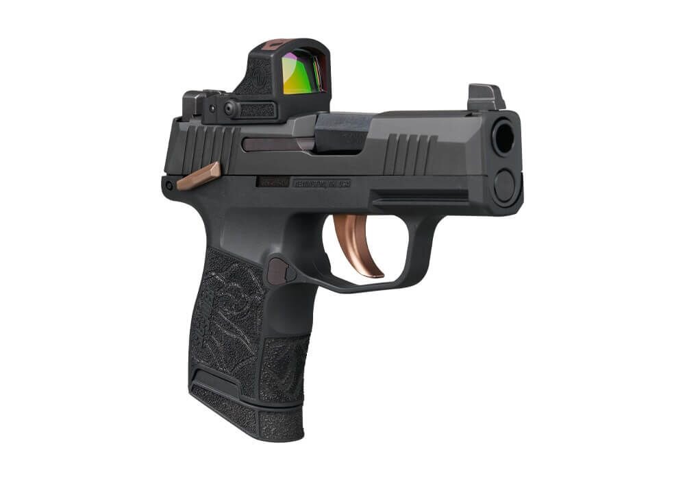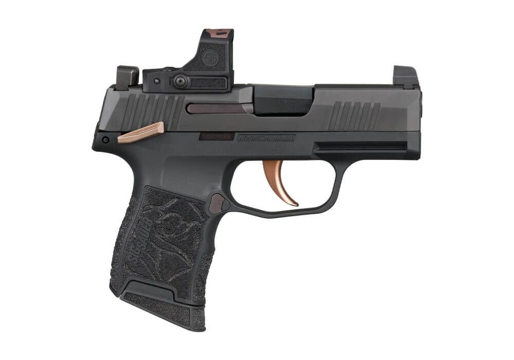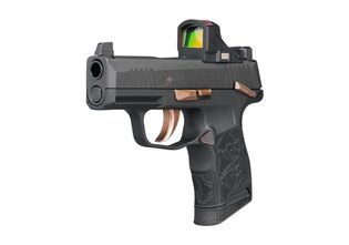 The grip module is laser-engraved with the ROSE motif. The proven P365 ergonomics ensure a secure and comfortable grip. The pistol is fitted with XRAY3 day/night sights, enabling reliable sight alignment in varying lighting conditions.