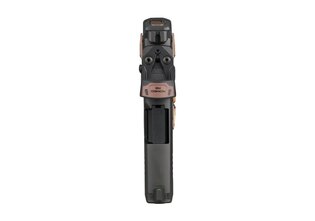 The pistol features a skeletonized stainless steel chassis in the ROSE configuration, installed within a high-strength polymer grip module. This hybrid design preserves structural integrity while keeping overall weight low. A manual thumb safety enhances handling security. Controls are finished in a matte ROSE Gold tone.