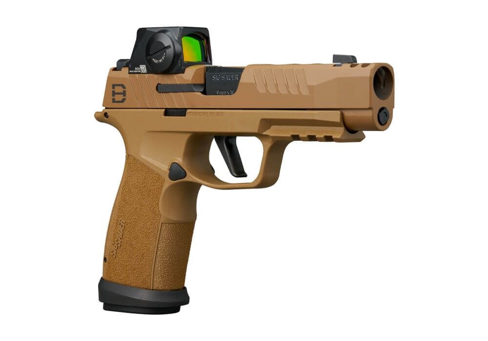 The stainless steel slide features distinctive DH3 serrations and lightening cuts. A Coyote Cerakote finish enhances surface durability while giving the pistol its characteristic appearance. The configuration is both functional and visually distinct from standard P365 variants.
