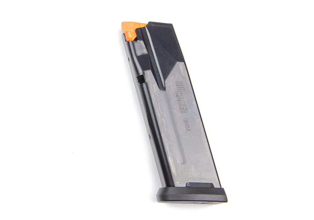 The P365 XMACRO COMP utilizes steel double-stack magazines with a 17-round capacity. The package includes two 17-round magazines featuring high-visibility followers for quick visual confirmation of unloaded status. Despite the increased capacity, the pistol maintains an approximate 1-inch overall width.