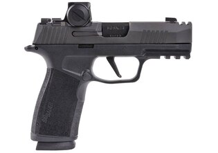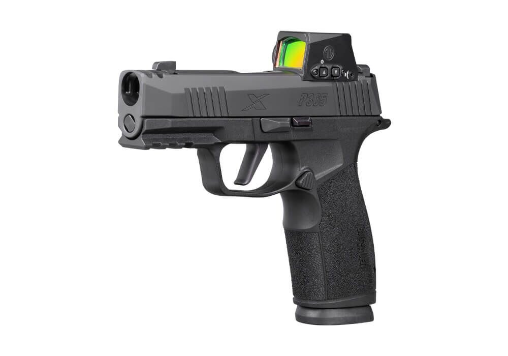 The pistol is factory-equipped with the SIG Sauer® ROMEO-X Compact red dot sight. The optic features a CNC-machined 7075 aluminum housing, distortion-free aspherical lens, and MOTAC™ (Motion Activated Illumination System). The reticle offers a selectable 2 MOA dot or 32 MOA circle. Its low deck height allows co-witness capability with standard XRAY3 tritium night sights. The battery is side-loading for convenient replacement without removing the optic.