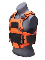 Adjustable shoulder straps and cummerbund provide precise fitment, ensuring stability even under full load. Ballistic shoulder pads are included in the standard configuration to enhance comfort during prolonged wear. A reinforced emergency drag handle supports casualty extraction. This variant also features enlarged rear hook-and-loop identification panels for prominent markings, which is essential during rescue operations.