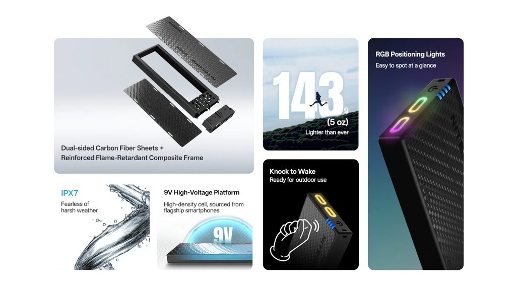 The power bank body is made from reinforced polymer with carbon fiber elements, increasing resistance to wear and mechanical damage. Impact-resistant corner cushions help absorb shocks from drops or rough handling in the field. The construction is designed for real-world outdoor conditions where gear is exposed to demanding environments.