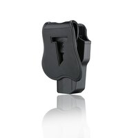 The holster is intended for use with Glock 17 Gen5, Glock 17, 22, 31 (Gen 1, 2, 3, 4) handguns. It is fitted with an automatic index-controlled safety. It allows for a smooth draw, with a natural grip on the gun and a gentle squeeze on the release pin. This modern design provides quick retrieval and then automatic securing of the weapon after being put back in the holster. It has a maximum variable 360° angle setting thanks to the rotating handle. It allows for many ways to carry (paddle, MOLLE sling, belt clip or buckle and more).