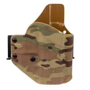 OWB Frogy holsters feature a screw for automatic tension adjustment, allowing you to regulate the weapon's grip, even for pistols equipped with a flashlight at that moment. Thanks to the open construction of the holster, you can also insert a weapon with an extended threaded barrel, compensator and even a reflex sight. This construction also ensures easy cleaning of the holster.