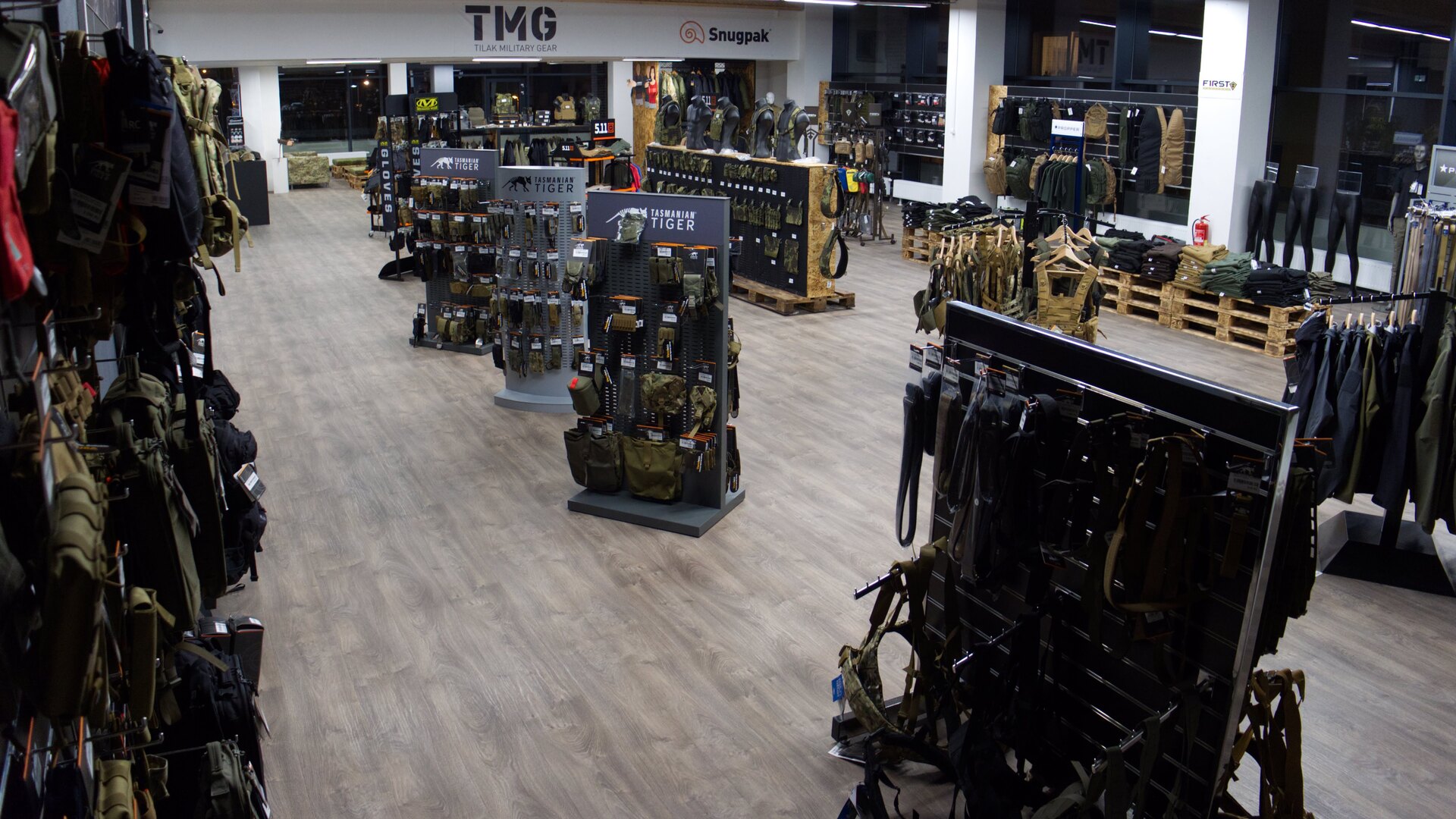 On the first floor you find products designed primarily for armed forces, law enforcement, security agencies, fire rescue etc. There are guns and accessories, self-defence equipment, clothes and others. On the second floor you find footwear and everything for outdoor, travelling and camping.
