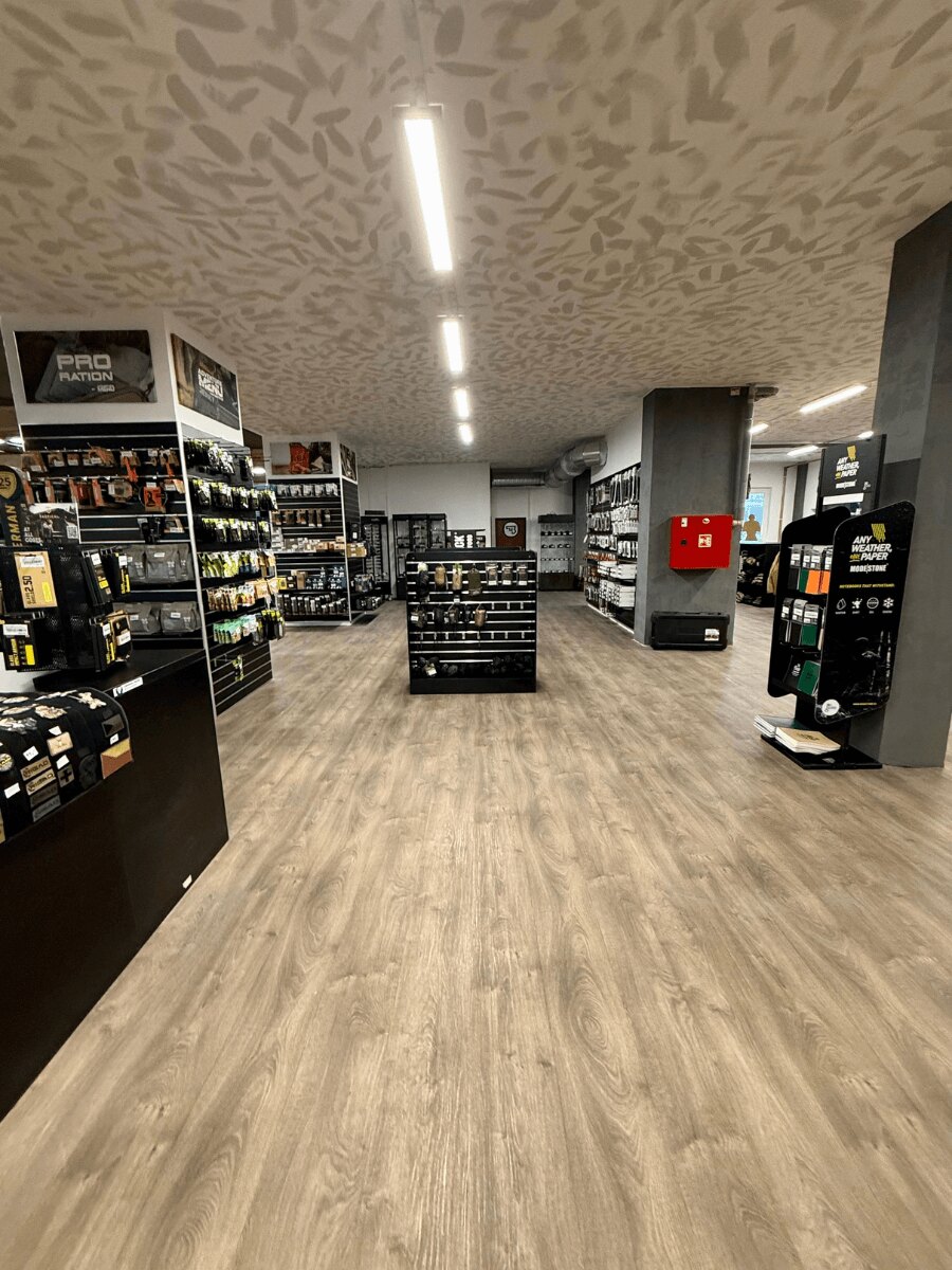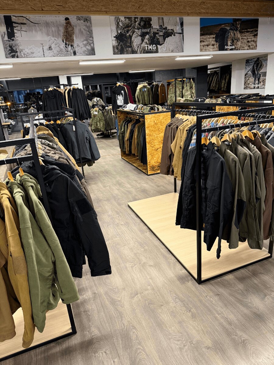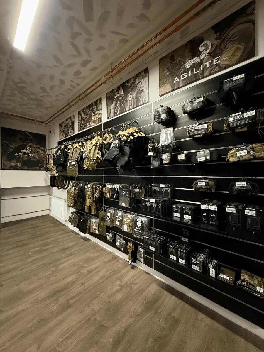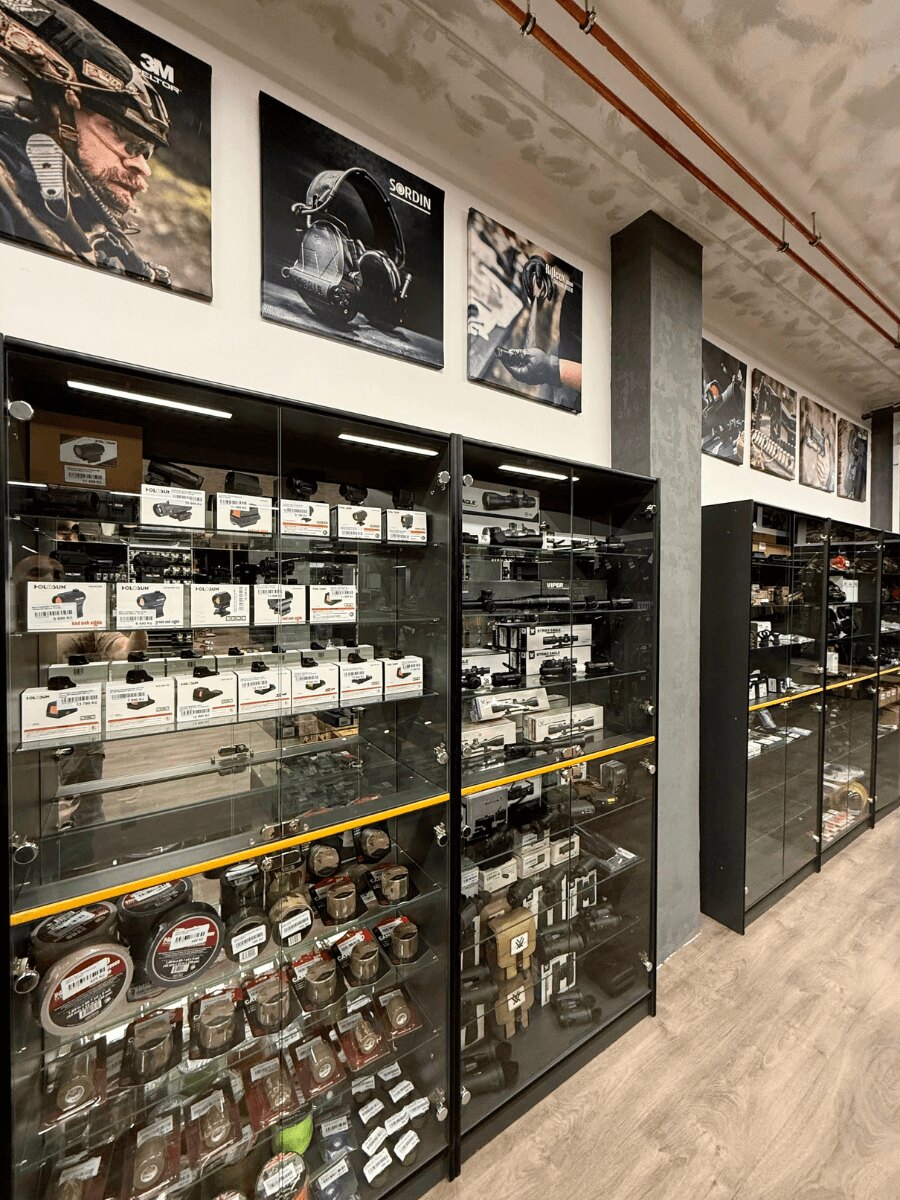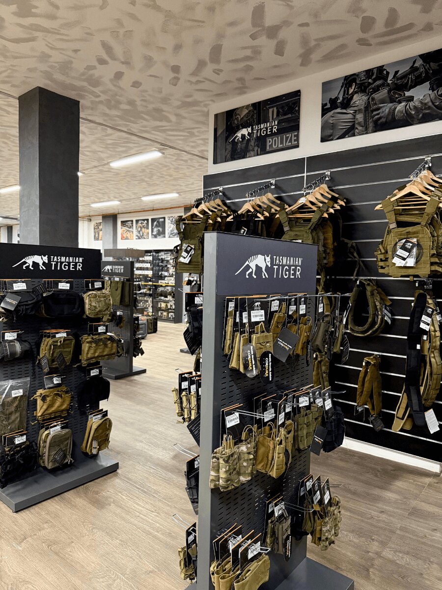 On the first floor you find products designed primarily for armed forces, law enforcement, security agencies, fire rescue etc. There are guns and accessories, self-defence equipment, clothes and others. On the second floor you find footwear and everything for outdoor, travelling and camping.