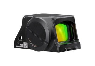 Motion-activated illumination powers the optic on when movement is detected and conserves battery life when inactive. Brightness is adjusted via easily accessible controls, with settings compatible with night vision devices. The battery compartment is accessed from the side, allowing replacement without removing the optic from the slide.
