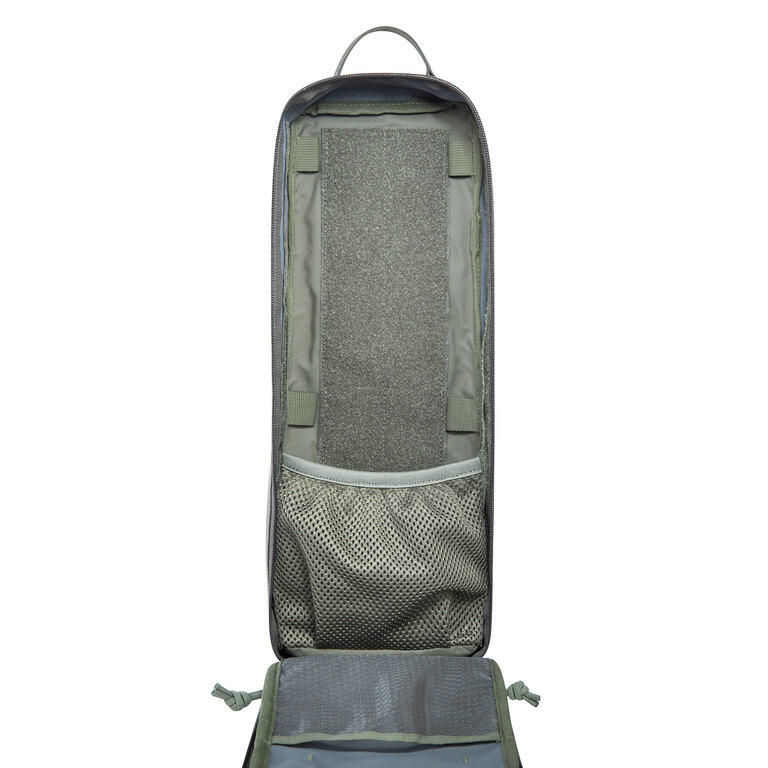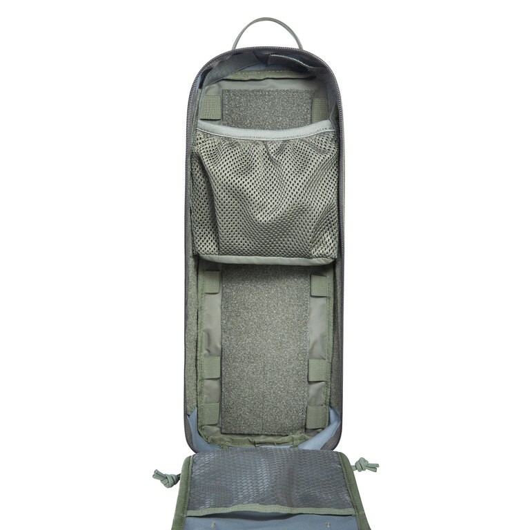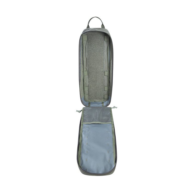 The interior features a padded hook-and-loop divider that splits the space into two compartments. Integrated MOLLE panels allow attachment of additional pouches or organizers, while mesh and zippered pockets keep smaller items securely arranged and easily accessible.