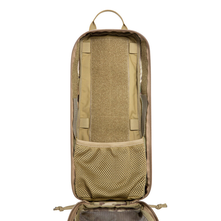The interior features a padded hook-and-loop divider that splits the space into two compartments. Additional mesh and zippered pockets keep smaller items such as batteries or tools securely organized. The integrated MOLLE system allows further customization with modular accessories.