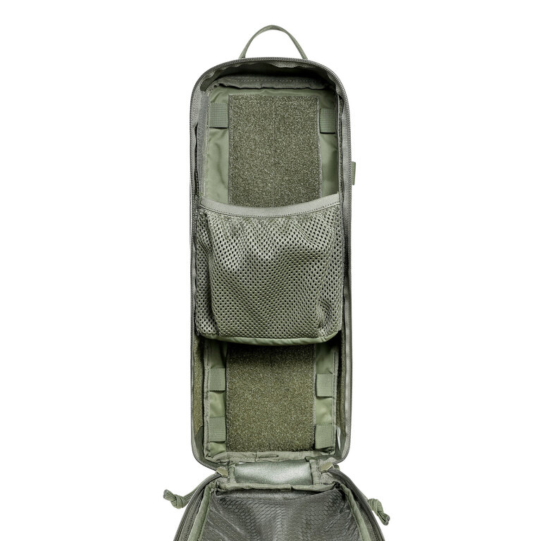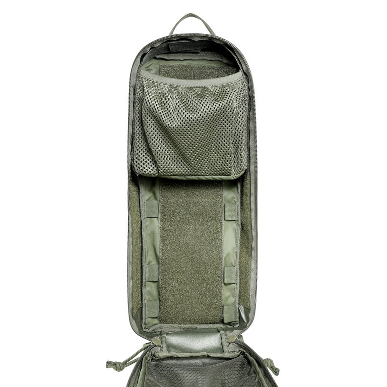 The interior includes MOLLE panels for attaching additional pouches or organizers as needed. A padded hook-and-loop divider allows you to split the space into two compartments, making it easy to separate and organize gear. Mesh and zippered pockets help keep smaller items secure and accessible.