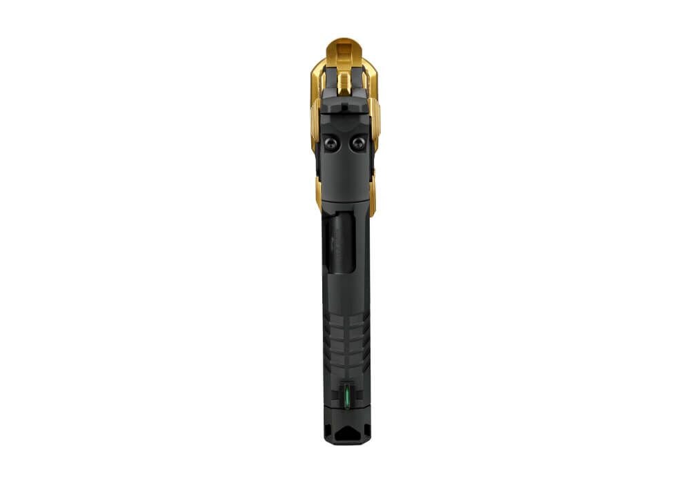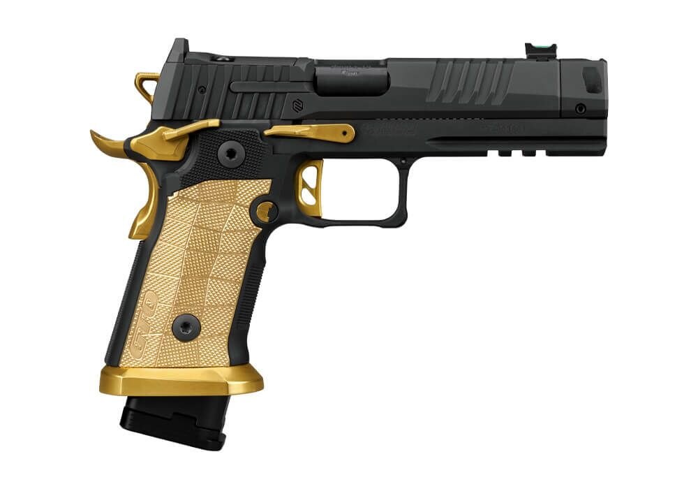 The platform is built on a stainless steel frame complemented by an aluminum grip module. Controls, trigger, and magwell feature a high-gloss titanium nitride (TiN) finish for enhanced corrosion resistance and wear durability. Brass LOK grip panels with GridLOK texture add mass in the grip area, improving balance and recoil control.