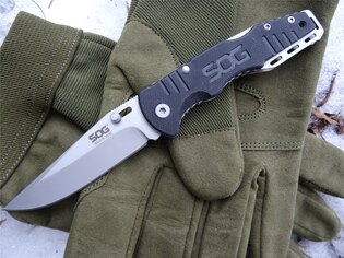 The blade bears the word SOG SALUTE MINI, the textured word SOG on the handle, and the same wording is even moulded onto the attachment clip. I know.