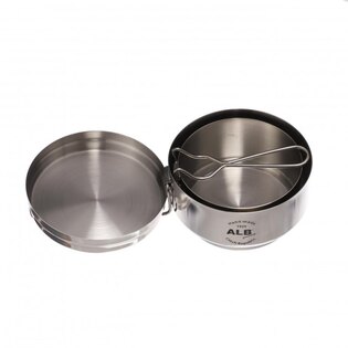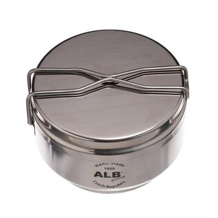 Almost all of us had it at camp and it is an inseparable part of our childhood, like gummy bears or a fizzies. Mess kit preserves the years-proven design and adds a high-quality stainless steel design. The set is three-piece and includes a small and a large bowl. The bowls are equipped with wire handles and lids. The cookware is intended for the preparation of hot and cold dishes (or heating of liquids, etc.). The cookware is suitable for time in nature, camping, equipping armies, workers in the forest, etc. The ALB set is made of stainless steel CrNi 18/10 (1.4304), the thickness of the material is 0.8 mm. The handles are made of 4 mm thick stainless steel wire (1.4016). Mess kits have a polished surface on the inside and a finely ground surface on the outside. Thanks to the use of high-quality stainless steel material and its thickness, the whole set is very durable and has a long service life. Thanks to the thickness of the material, heat is distributed better when heated. The unique system of handles ensures that the entire set, inserted into itself, holds together, and at the same time, into the smallest bowl can fit most of the small gas cartridges produced for stoves.
