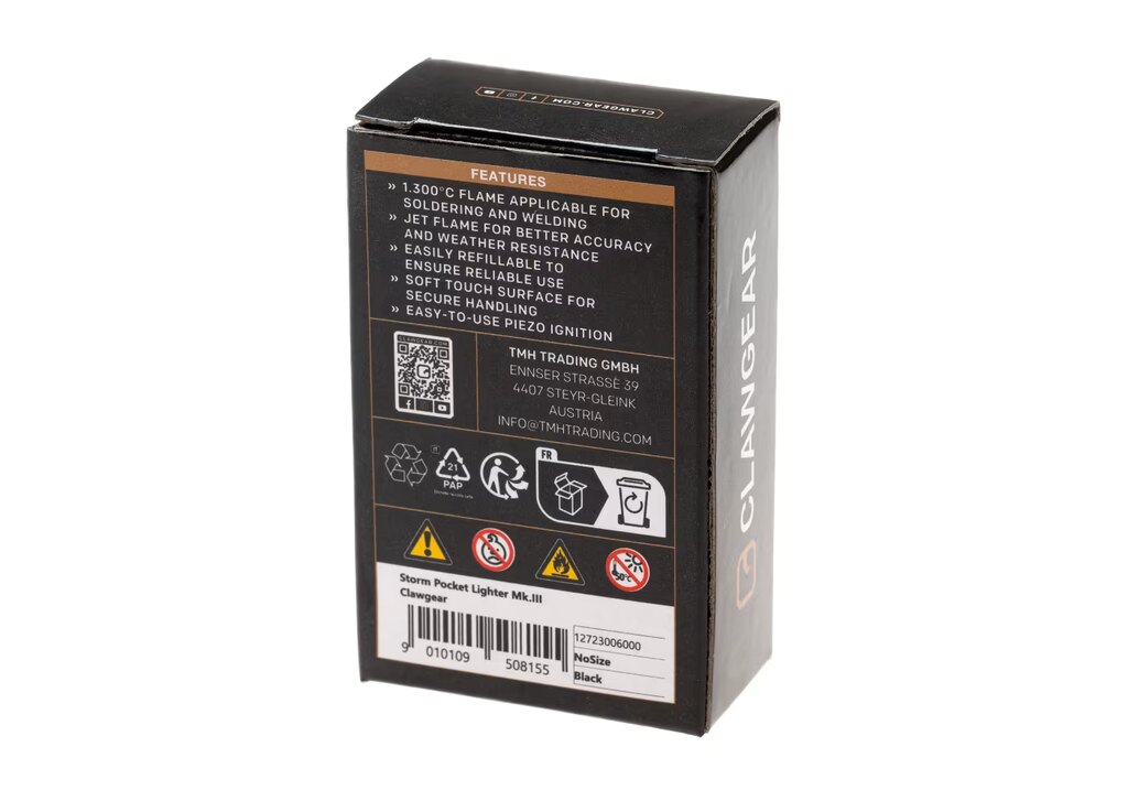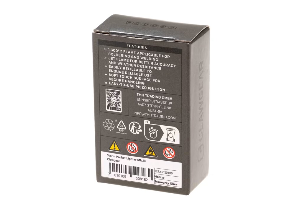 The Clawgear® Storm MK III is a compact pocket lighter equipped with a wind-resistant jet flame. It is designed for reliable ignition in outdoor and demanding conditions where a standard flame may be insufficient. The concentrated flame reaches temperatures of up to 1300 °C and allows controlled and precise use.