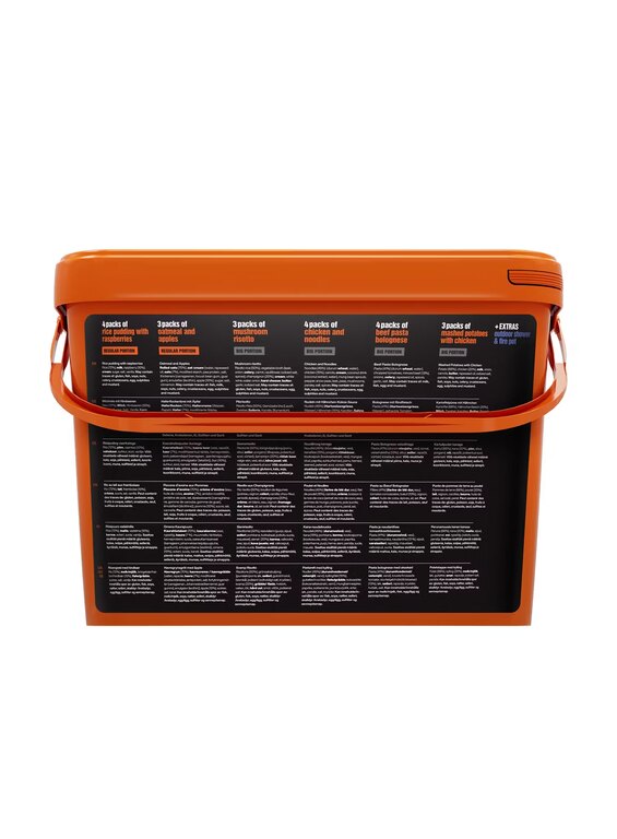| Other specifications | Large package - cheaper than buying each meal separately Freeze-dried meal with high energy content GMO free Without palm oil and starch Prepared from natural ingredients, without preservatives Without "chemistry" and unnecessary additives Real taste Long shelf life - up to 8 years from the date of manufacture Storage temperature: 10°C to 30°C Made in Germany Approved and verified by NATO Nato stock number (NSN): 8970-38-001-5443 --- Each meal packed in a resealable package Easy preparation - open the bag, pour hot water, stir and reseal Remove the oxygen absorber before adding water! The required amount of water is indicated on the bag (from 150ml) Waiting time after pouring: indicated on the bag (5 min to 10 min) Option for preparation with cold water as well (longer waiting time, cold food) |