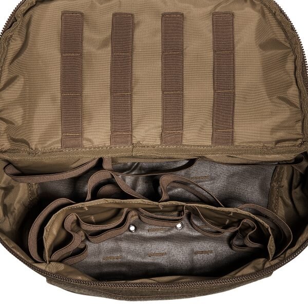 The inner part of the hip bag is equipped with elastic loops, where you can attach medical supplies and other equipment. In addition to the large pocket that provides the main storage area, there is also a smaller pocket for scissors. The hip bag has an external MOLLE compatible webbing, thanks to which you can attach it to tactical vests, belts, modular backpacks and many other parts of equipment.