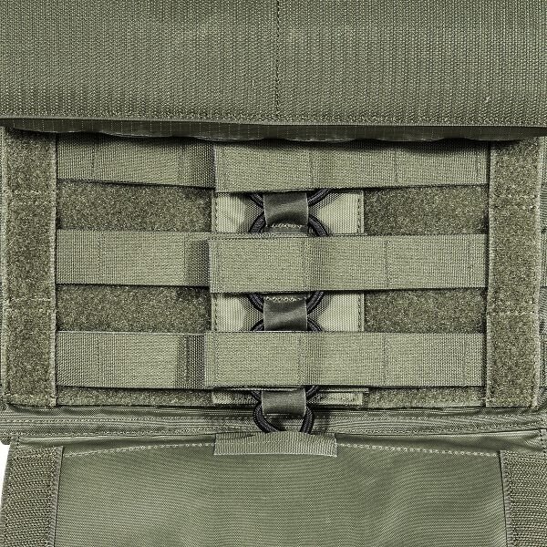 Comfortable wearing is ensured by padded shoulder straps with adjustable length, on which you will find velcro straps for attaching cables or hydration bag hoses. The front side of the carrier has a velcro panel on the chest for attaching an ID label or patch, below it is an area with a low-profile MOLLE system, in the lower part complemented by Velcro for attaching pouches and other equipment. The ballistic plate with a maximum size of 30 cm x 25 cm is inserted into a pocket with an elastic edge and Velcro fastening. The back of the carrier is completely covered with a laser-cut MOLLE webbing. By unfolding the lower part, you get to the area used for exchanging side parts and adjusting their size. The chest and back of the carrier have a pleasant padding and it is comfortable even under heavy load. Next to each side ROC buckle there is a detachable pocket for the radio with easy access to its controls. The side part can be made of a maximally breathable version with elastic straps, or you can fit it with a full belt with a laser-cut MOLLE webbing. In the second case, this space is suitable after attaching other pockets, including those for the side ballistic plates. The great advantage of this plate carrier is its compatibility with the Tasmanian Tiger Assault Pack 12 tactical backpack. Thanks to the proven Cordura material, from which the carrier is mostly made, it can withstand use in the toughest operating conditions.
