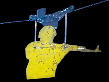The shape and size of the target simulate a soldier figure with an AK-type rifle, offering real dimensions that are essential for practicing real-life situations. The shooter engages with proportions that closely match an actual target, aiding in skill transfer from training to real-life scenarios.