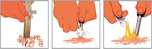 Just cut a few "shavings" from the sticks, create a sparkle and the fire is set. It is of course possible and equally effective to light the stick as such.