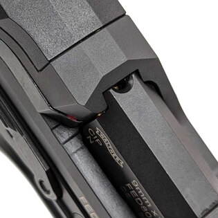 The improved magazine well or magwell simplifies magazine changes for more accurate and faster reloading even in stressful situations. A magazine with an above-average capacity of 18 rounds is available.