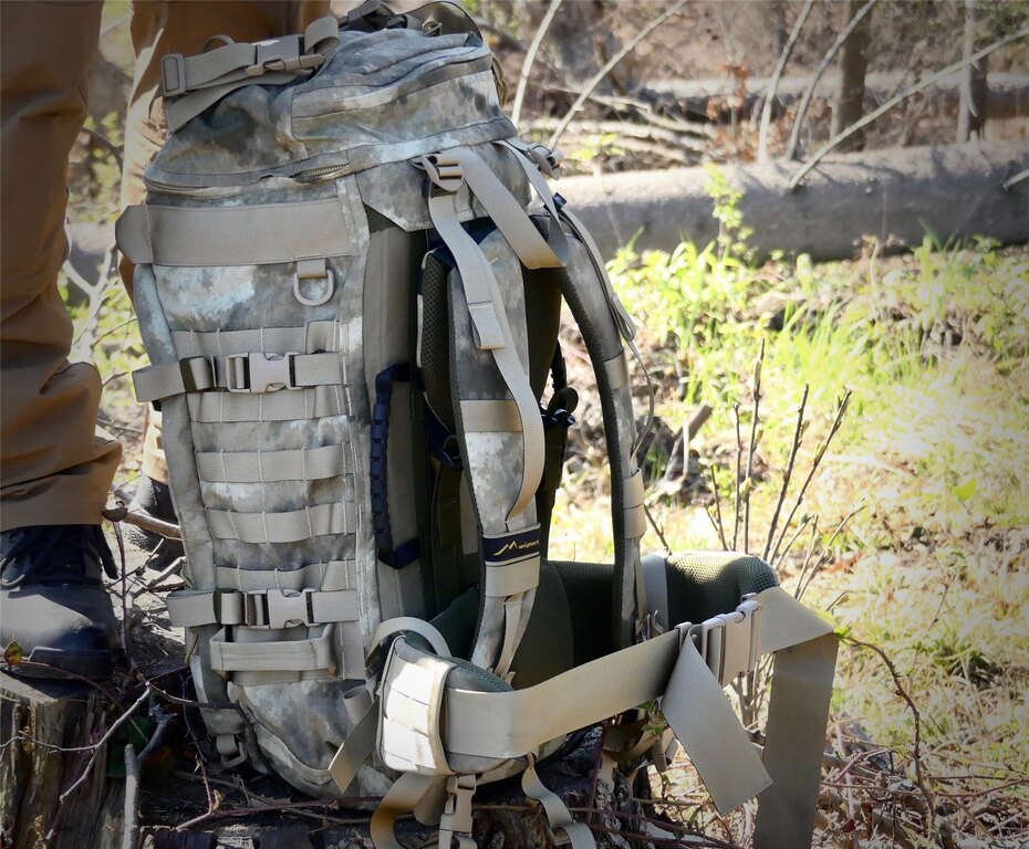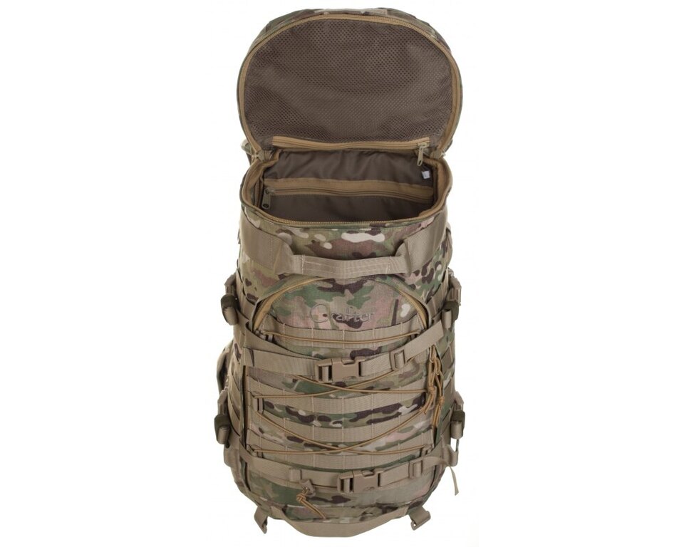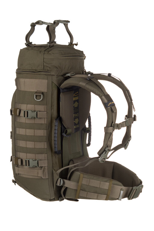 | Other specifications | Compatible with hydration bladder - pocket on the back of the backpack with a side zippered entry, drinking tube opening covered by a flap with Velcro closure, holders for the drinking tube on the shoulder straps Carrier system: FAS Plus Ergonomic (Military) (fully adjustable system) Aluminum frame with black surface finish Reinforced stitching for greater durability --- Spacious main compartment with 2 entrances - through a top covered lid fastened with a two-way zipper and front covered lid fastened with a two-way zipper 2 zippered pockets on the top lid - a small one with front access and a large one with rear access 1 mesh pocket fastened with a zipper on the inner side of the top lid 1 mesh pocket fastened with a zipper on the inner side of the front lid 1 pocket fastened with a zipper on the back of the main compartment 2 fixation straps with quick-release buckles on the back of the main compartment Double bottom of the backpack secured with Velcro conceals the supplied rain cover --- Compression straps (2 on each side and 2 at the front) Transport straps on top "D" rings - 2 at the top on the sides (1 on each side) + 2 at the front bottom (1 on each side) + 6 at the front on the sides (3 on each side, with an elastic cord threaded through) Velcro panel on the lid MOLLE compatible binding at the front and sides Elastic cord on the front Paracord grip fitted on outer zipper sliders |